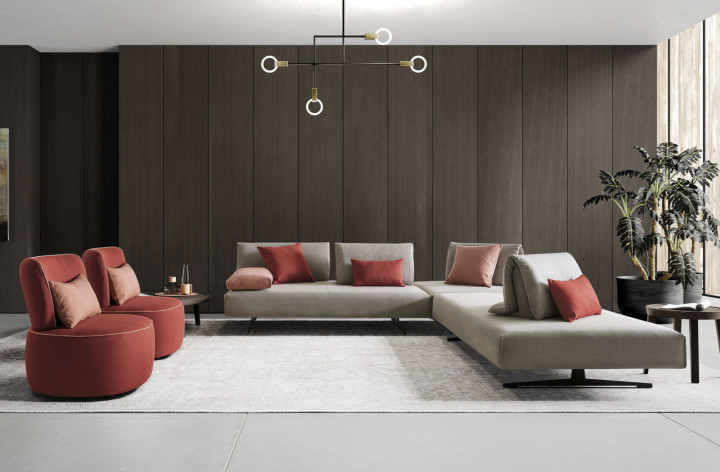 Un Abbraccio illumina il salotto di casa con la freschezza della spontaneità, ben rappresentata dalla libera e disinvolta disposizione degli schienali, protagonisti di una frizzante danza compositiva diretta dal gusto personale di chi abita e ama la propria dimora.