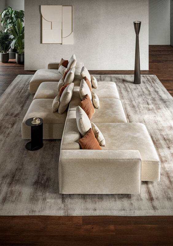 Il comfort massimo della seduta monoscocca, garantito dal sistema di imbottitura Tecnocel, e la totale modularità delle sezioni, rendono questo modello la soluzione ideale se cerchi un divano versatile e comodo, che ti consenta di riconfigurarlo nel tempo. Infatti, ogni elemento è rifinito su tutti i lati e può vivere anche da solo, trasformandosi in un’isola di comfort indipendente. Inoltre, puoi anche scegliere di creare una composizione bifacciale, perfetta per spazi espositivi e living importanti dove il divano diventa fulcro dell’ambiente.