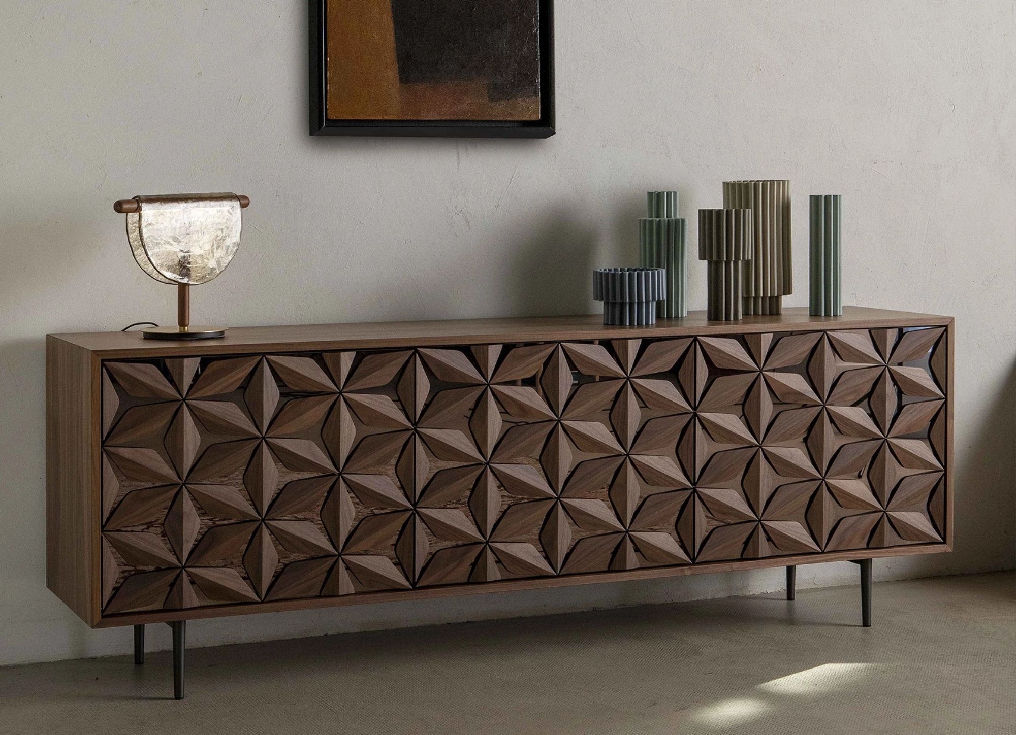 La madia All Star fonde la sua linea essenziale alla preziosa costellazione di petali in legno massello, applicati a mano, che ricoprono le ante dalle basi specchiate, per un elemento unico di design e alta artigianalità.
